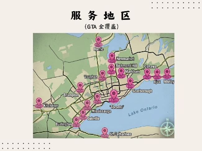 • 西部/北部: Mississauga, Oakville, Burlington, Brampton, Etobicoke, Vaughan, Kitchener, Barrie, St. Catharines