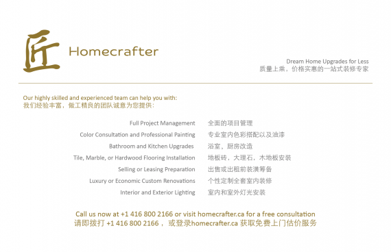 ★ 免费上门估价,准时守信,恭候您的垂询(+1 647 821 7914/ 416 800 2166/www.homecrafter.ca)