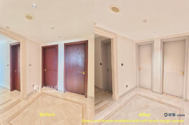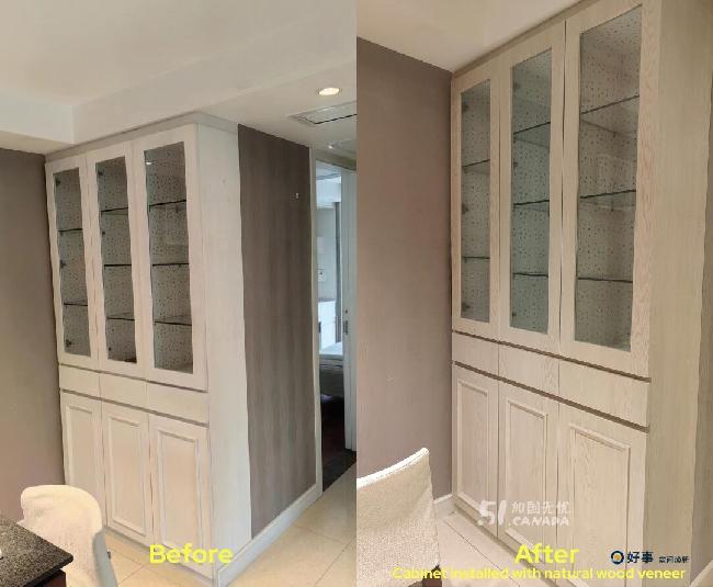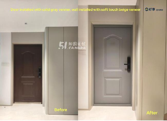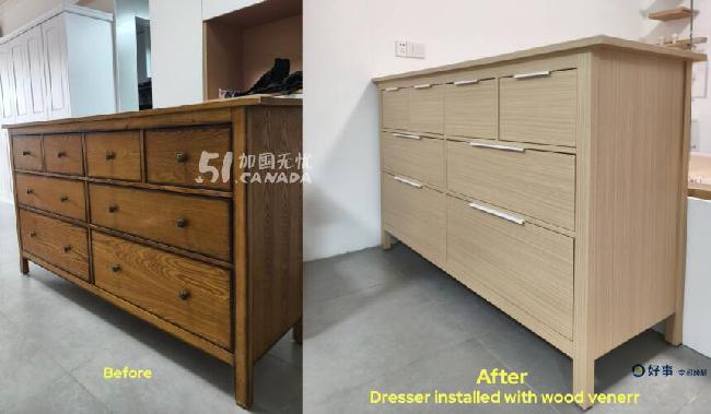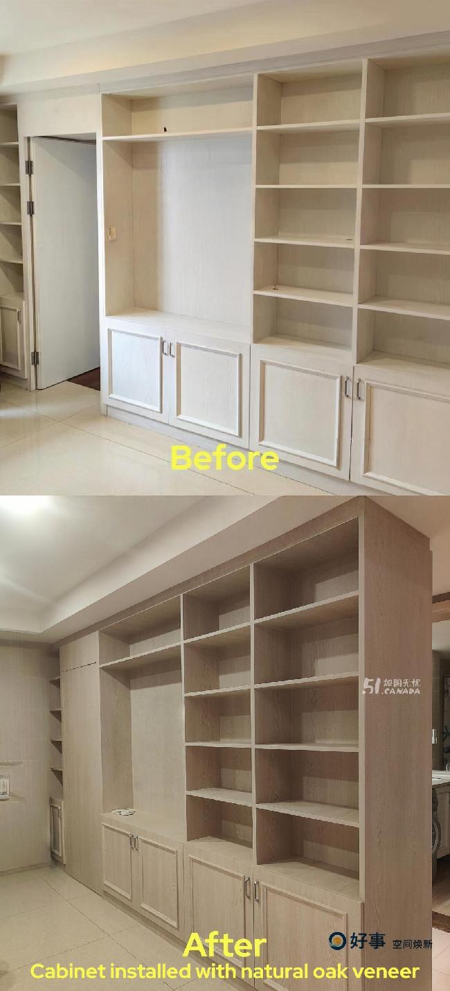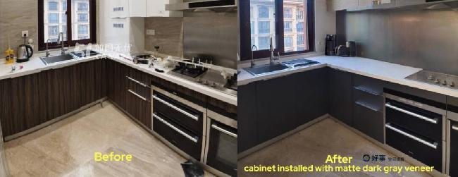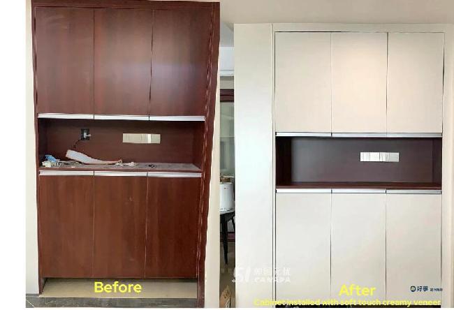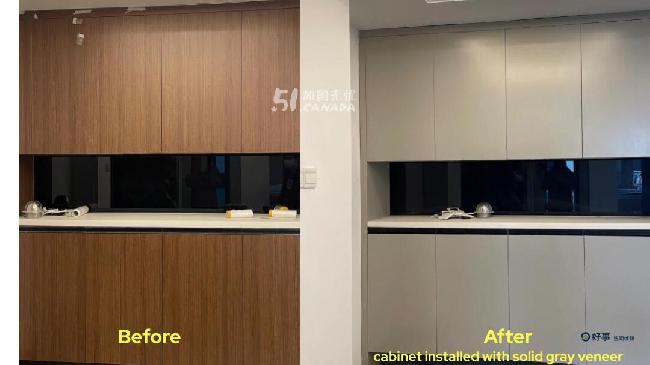 我们使用的是商业级饰面膜(Refacing Veneer),不是普通DIY贴纸,电商或建材店售卖的材料