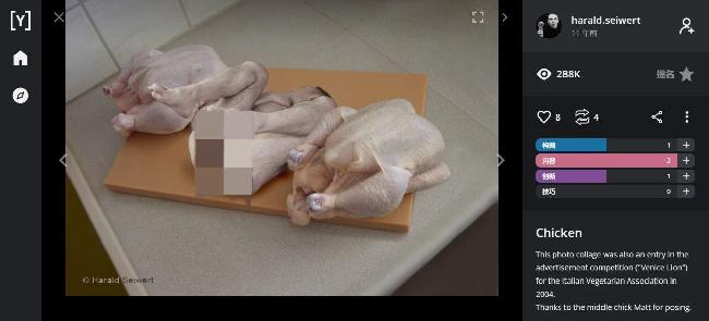 这其实是德国艺术家2003年的合成摄影作品,用整鸡与成年男性裸体拼贴,讽刺肉食工业,在国外属于梗图级老素材。