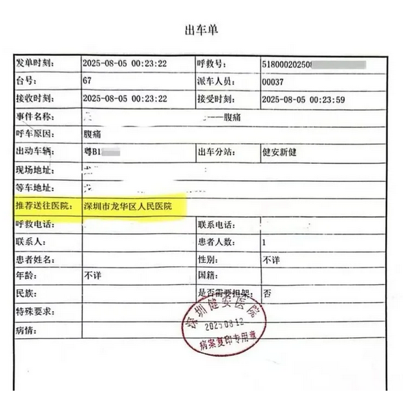 2025年8月5日凌晨,54岁的张女士突发腹痛,家属拨打了120。120出车单上写明,救护车的出车站为“健安新健”,目标医院为深圳市龙华区人民医院,与家属意愿一致。但救护车开向了距离更远的深圳市健安医院,也就是这辆救护车所属的民营医院。
