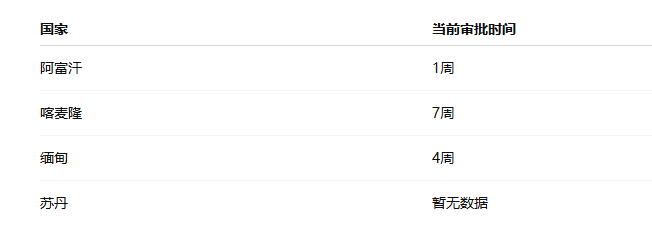 截至2026年3月11日,英国禁令涉及国家的处理时间为: