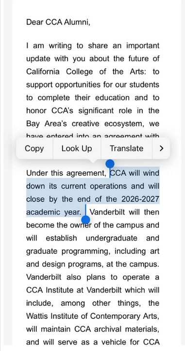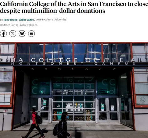 本周二,北加州最后一家非营利艺术与设计学院——加利福尼亚艺术学院(CCA)宣布,将在2026-2027学年结束后关闭校园。