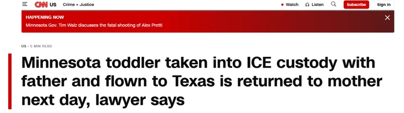 明尼苏达州一名年仅2岁的女童于1月22日周四在明尼阿波利斯与父亲一同被美国移民与海关执法局(ICE)拘押,并在当晚被送往德州。虽然法院已明确下令要求立即释放女童,但该家庭律师表示,她仍被送往德州,并最终于周五下午才被送回母亲身边。