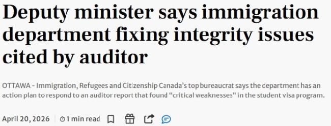 加拿大移民、难民及公民部(IRCC)副部长 Ted Gallivan 日前表示,部门正加紧修补学签项目的监管漏洞,并承诺将在 2026 年底前全面落实整改计划。
