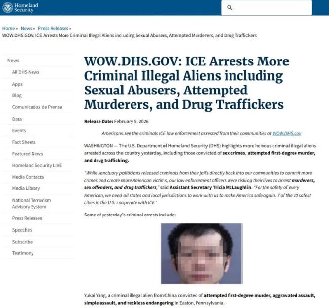 据国安部最新消息,因投毒室友被判7至20年监禁的Yang某,如今已服满最低刑期,并被移交给美国移民与海关执法局(ICE),启动遣返程序。