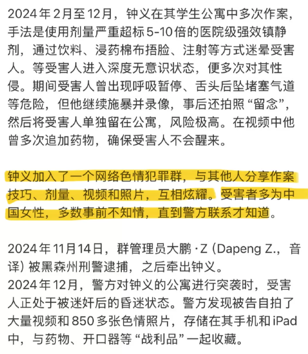 这桩案情之恶劣,让主审法官直接在庭上斥其“禽兽不如”。钟某在长达一年的时间里,利用高剂量麻醉剂对同为邻居的同胞女友实施了至少8次强奸,甚至在受害者数次呼吸骤停、濒临死亡的情况下依然没有停止暴行。更令人不寒而栗的是,他并非孤狼作案,其背后隐藏着一个名为“德国驾校”的加密群组,里面充斥着对女性进行“狩猎”的黑暗黑话和犯罪录像。