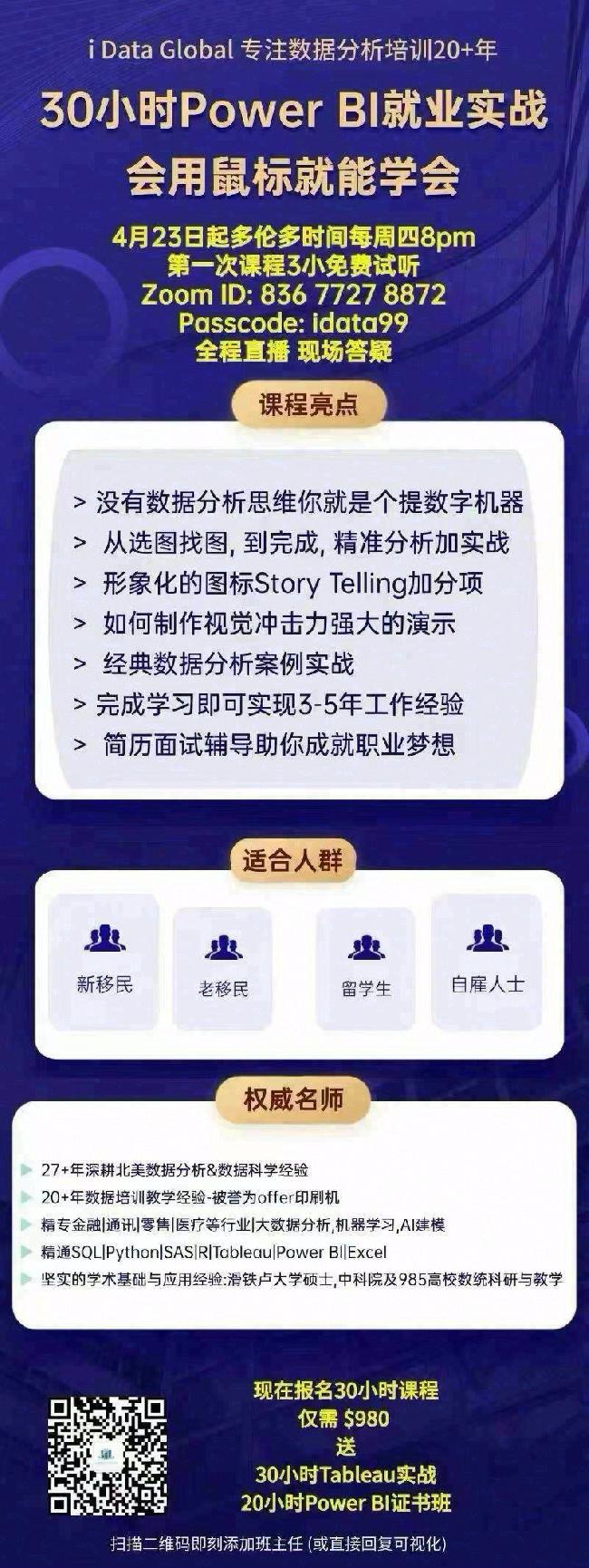 i Data Global 由两名北美逾20+年教学经验,27+年全球100强在职顶级数据分析师、技术面试官担任主讲(精通SAS/SQL/Tableau/Python/R/Excel/Power BI),19年来帮助数千名零基础无背景的普通人找到高薪稳定的数据分析工作,融入主流社会。