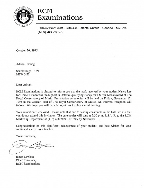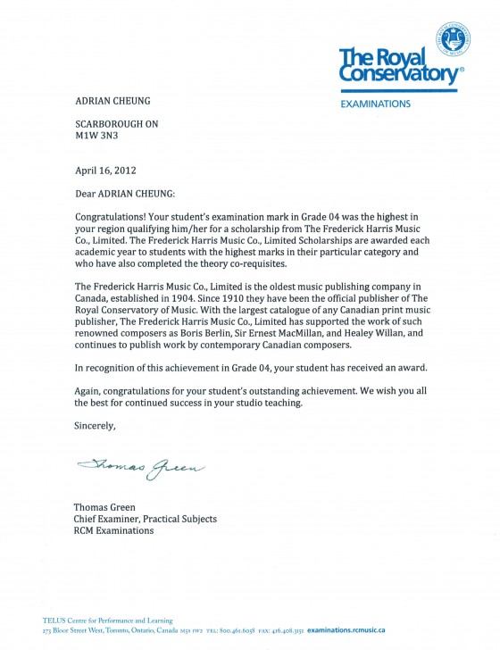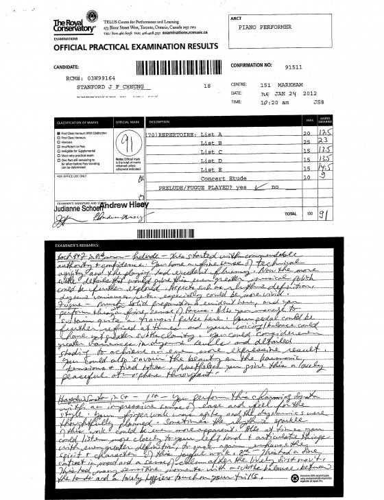 学生钢琴演奏级: LRCM(皇家音乐院钢琴演奏最高专业级别)成绩:92%; ARCT 成绩:91%, LTCL, LCCM Distinction