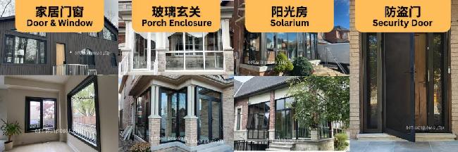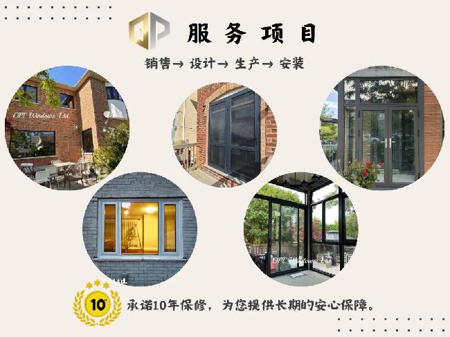 我们的专业服务项目: 设计, 生产, 安装住房窗户大门、节能阳光房、防盗门等