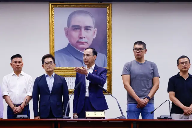 图像来源,EPA图像加注文字,国民党主席朱立伦(中)将总统赖清德比喻为希特勒,遭德国在台协会与以色列在台办事处严厉谴责