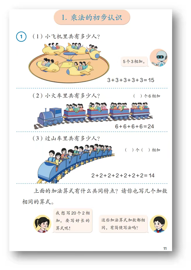 用大白话说, 在孩子刚学习乘法的意义时,之所以只给出了一种算式,即相同加数在前,相同加数的个数在后,为的是和情境更对应,方便学生理解乘法的意义。但是,学会了后,后面的要求就没有这么严格了。