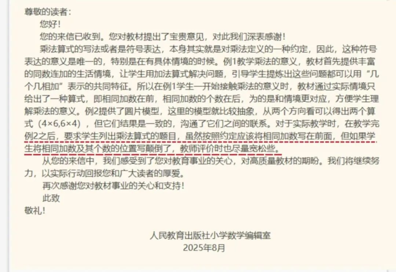 出版社在回复中表示:乘法算式的写法或者是符号表达,本身其实就是对乘法定义的一种约定,因此,这种符号表达的意义是唯一的,特别是在有具体情境的时候。
