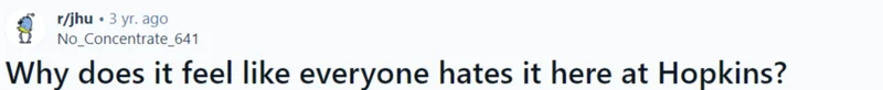 原因之一是,大佬云集的地方,免不了卷生卷死,卷到身心俱疲。JHU的神经科学/化学工程/机械工程/计算机科学是真的好,但课程难度也是真的难度拉到爆表,大家整天埋头苦读,导致根本没有什么体育文化也没有什么school pride。