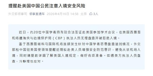中国外交部4月16日提醒赴美国的中国公民注意入境安全风险。中方并谈到西雅图塔科马国际机场连续发生针对中国学者恶意盘查滋扰情况,外交部和中国驻美国使领馆提醒近期拟赴美人员增强安全防范意识,避免从该机场入境。